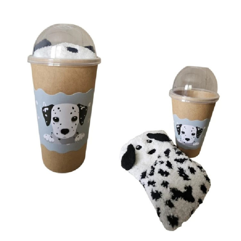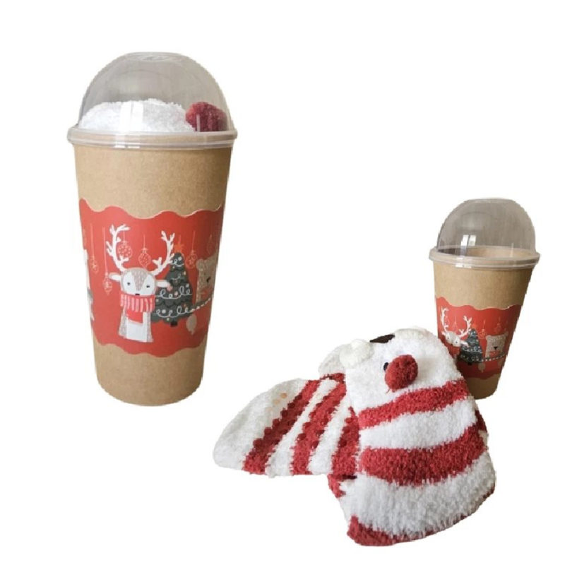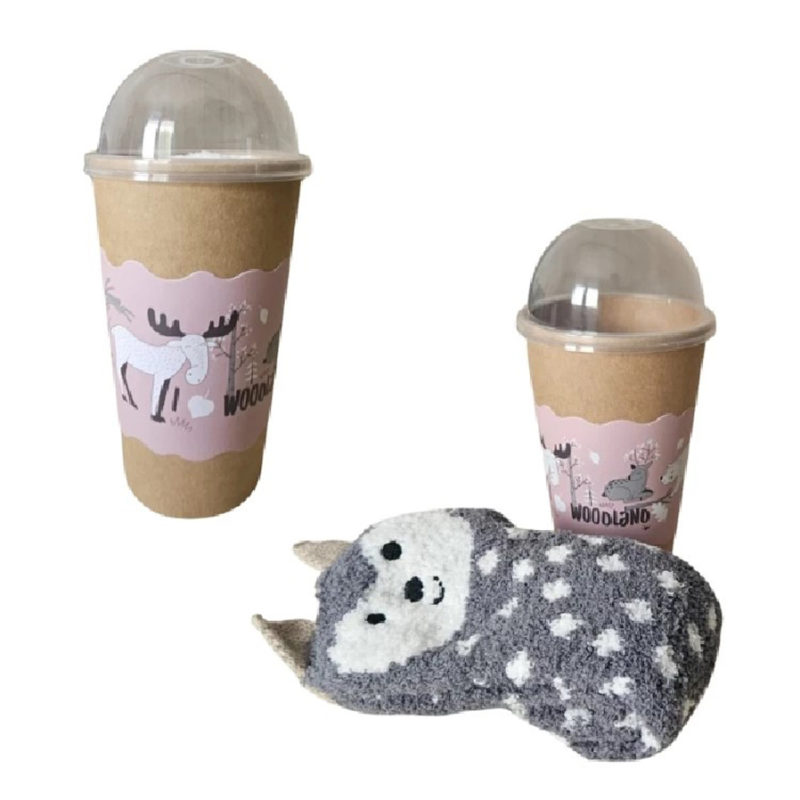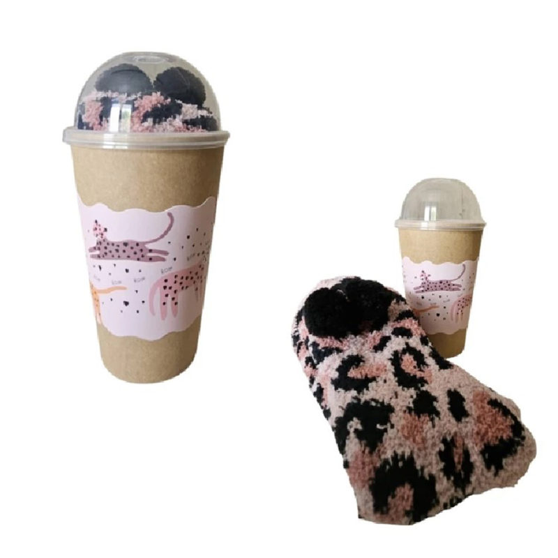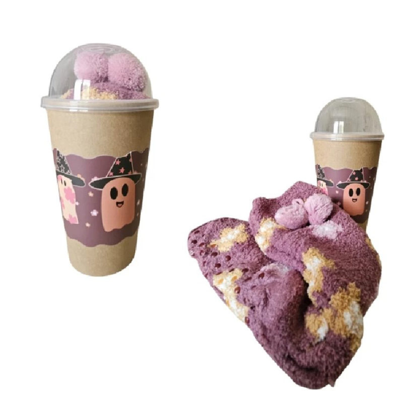 Caja contenedora de 6 pares de calcetines surtidos en tejido chenilla, presentación del producto envoltorio cupcakes.